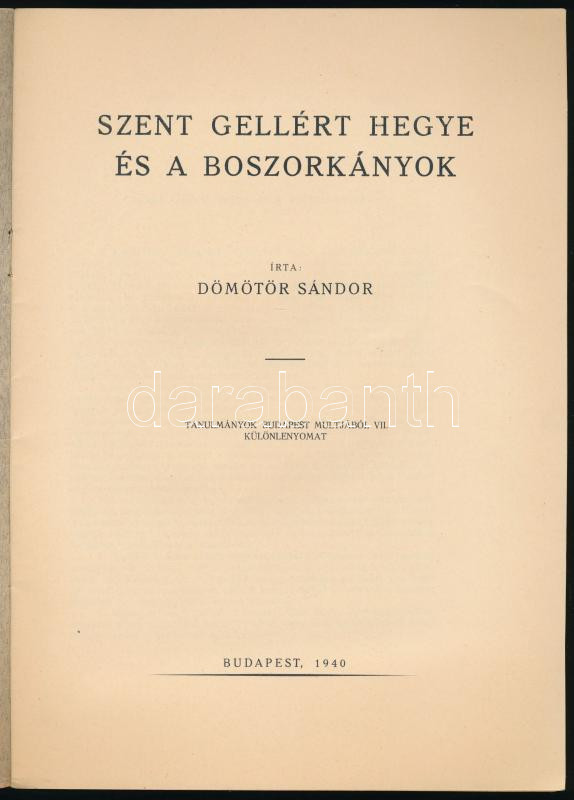 Dömötör Sándor: Szent Gellért hegye és a boszorkányok. Tanulmányok Budapest múltjából VII. (Különlenyomat). Bp., 1940, szerzői kiadás (Budapest székesfőváros háziny.), 22+(2) p. Kiadói tűzött papírkötés.