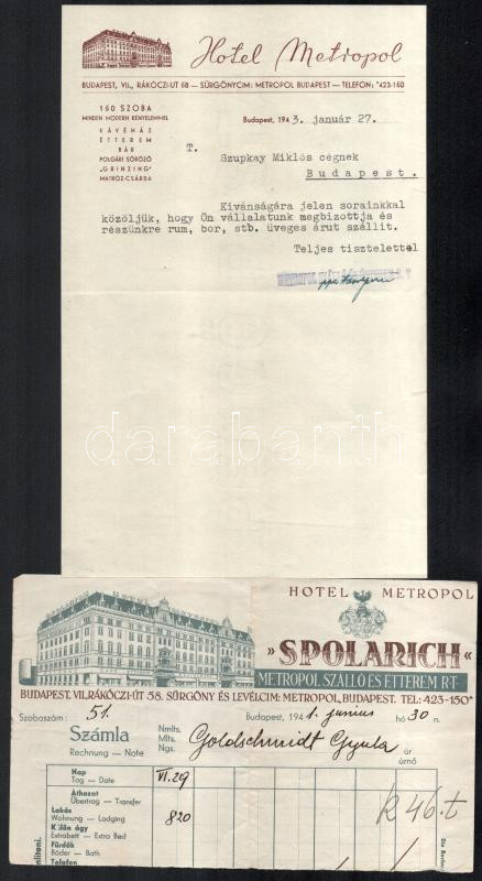 1941 Bp., "Spolarich" Metropol Szálló és Étterem R.T. fejléces számla,... https://www.darabanth.com/de/482-Fernauktion/482.0/Kunst-Dokumente-andere-Sammelgebiete/Dokument~2500004/1941-Bp-Spolarich-Metropol-Szallo-es-Etterem-RT-fejleces-szamla-hatoldalan-kezzel-irt~II3294762