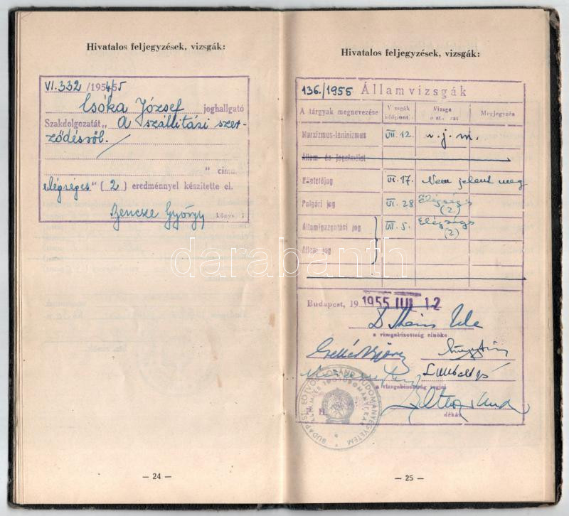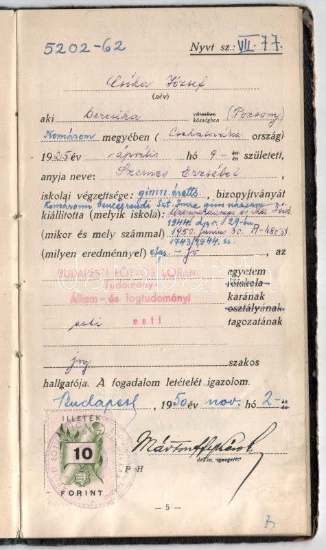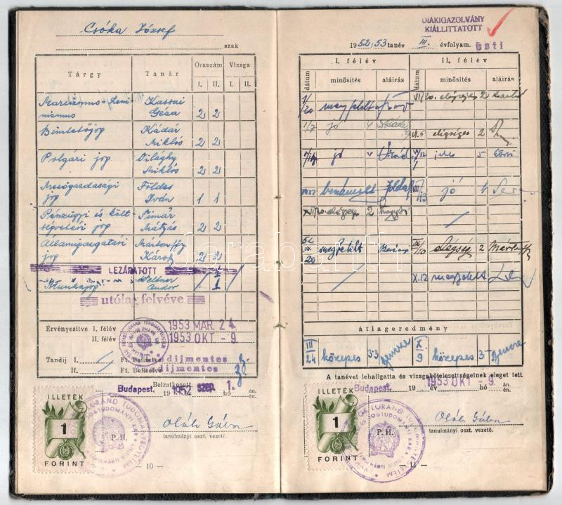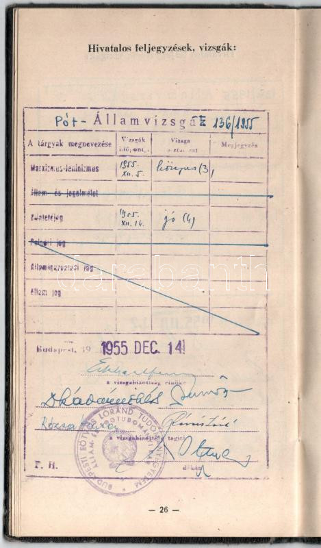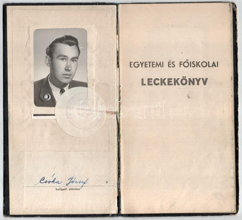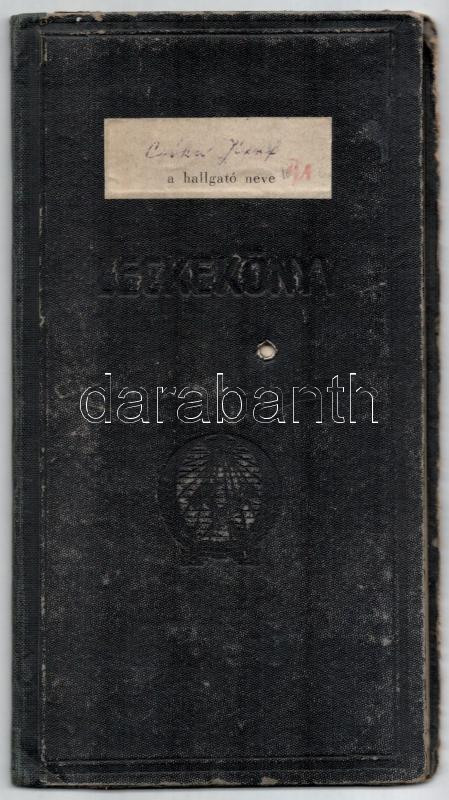 1950-55 ELTE jogi karának esti tagozatának hallgatójának fényképes leckekönyve, többek közt Mártonffy Károly dékán, Theiss Ede, Eckhart Ferenc, Sarlós Márton, Vas Tibor, Kádár Miklós, Marton Géza, Világhy Miklós, Földes Iván, Timár Mátyás későbbi pénzügyminiszter és más neves jogtudós, egyetemi tanár autográf aláírásával, kissé kopott vászonkötésben.