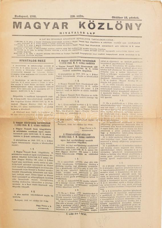 1946 Magyar Közlöny 1946. okt. 18. száma, kis szakadással, 4 p. https://www.darabanth.com/de/482-Fernauktion/482.0/Kunst-Dokumente-andere-Sammelgebiete/Drucksachen~500013/1946-Magyar-Kozlony-1946-okt-18-szama-kis-szakadassal-4-p~II3297353