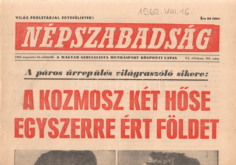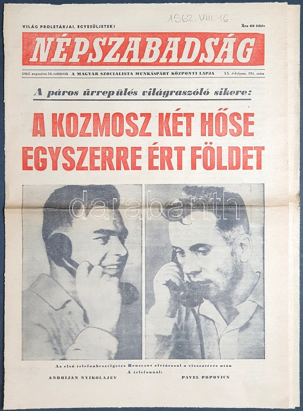 [Folyóirat] ,,A páros űrrepülés világraszóló sikere: A kozmosz két hőse egyszerre ért Földet". A Népszabadság politikai napilap ünnepi száma a harmadik szovjet űrrepülés befejezéséről. (XX. évfolyam, 191. szám, 1962. augusztus 16.) Budapest, 1962. Szikra Lapnyomda. 10 p. Folio. A második világháborút követően jelentős fegyverkezési verseny kezdődött az Egyesült Államok és a Szovjetunió között. Ennek a versengésnek volt az eredménye a nyugati világot sokkoló Szputnyik-1 műhold fellövése 1957 októberében, melyet a szovjet hírközlés nagy diadallal jelentett be. Újabb diadalnak számított szovjet oldalon - és a nyugati szorongás újabb epizódját szolgáltatta - az első űrrepülések sora, melyeket szovjet űrhajósok hajtottak végre: a Vosztok-1 űrhajó fedélzetén Jurij Gagarin 1961. április 12-én tett meg egy teljes fordulatot a Föld körül, majd 1961 augusztusában German Tyitov őrnagy is útnak indult a Vosztok-2 űrhajón, 25 óra idejű űrutazása alatt 17 teljes Föld-fordulatot megtéve. A harmadik űrrepülésre még merészebb tervet tűzött ki a szovjet vezetés: több napon át tartó keringést, mégpedig két szovjet űrhajó, a Vosztok-3 és Vosztok-4 együttes részvételével. A Vosztok-3 1962. augusztus 11-én kezdte meg útját, fedélzetén Andrijan Nyikolajev őrnaggyal, hozzá csatlakozott augusztus 12-i kilövésével a Pavel Popovicsot hordozó Vosztok-4. Az egymás melletti pályára állított két űrhajóról rádióüzenetek, sőt a Vosztok-4 fedélzetéről még három perc terjedelmű televíziós felvétel is érkezett, és négy, illetve három napi keringés után augusztus 15-én sikeresen landolt a két űrhajó. Illusztrált lapszámunk nyitóoldalán a két űrhajósról készült telefonáló portré, melyeken a felirat szerint magával Hruscsov elvtárssal értekeznek. A belíven összefoglaló jelentés a kettős űrhajóútról, interjú gyanánt rövid kivonat a leszállóhelyen adott nyilatkozatokból, tudósítói jelentés a Szovjetunió népeinek határtalan lelkesedéséről, illetve a szovjet kormány felhívása a világ népeihez és kormányaihoz, melyben a tudományosan és technológiailag megalapozott szovjetrendszer magasztalása mellett a szokásos békeüzenetek is elhangzanak. Lapszámunk első nyolc oldalán árad az öröm, a lelkesedés és a tudományos társadalomátalakítási kísérletek igenlése. Hazai körképként magyar munkásokkal készített villáminterjúk a kozmikus hőstett jelentőségéről. A záróoldalakon a bonni militaristák mesterkedéséről írt leleplező cikk, valamint termelési riport egy hazai üzemből. Jó állapotú lapszám.