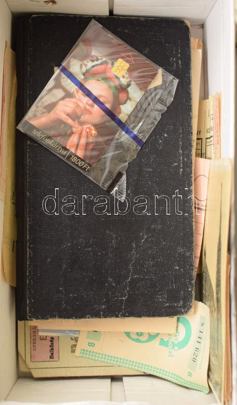 Kis doboznyi vegyes papírrégiség, közte bérlet, okmány, dr. Zorkóczy Lajos főszolgabíró névjegykártya, régi fotó, Zorkóczy József kecskeméti református jogakadémiai jegykönyve, bontatlan telefonkártya, stb.