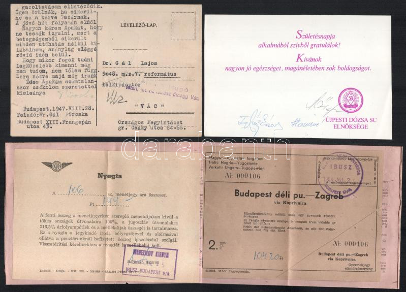 Beschreibung: cca 1946-1960 vegyes papírrégiség tétel: népbírósági ítélet, Pozsgay Imre aláírás, Ujpesti Dózsa aláírt emléklap, nemzetközi vonatjegy, stb