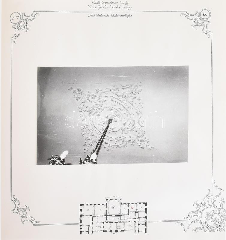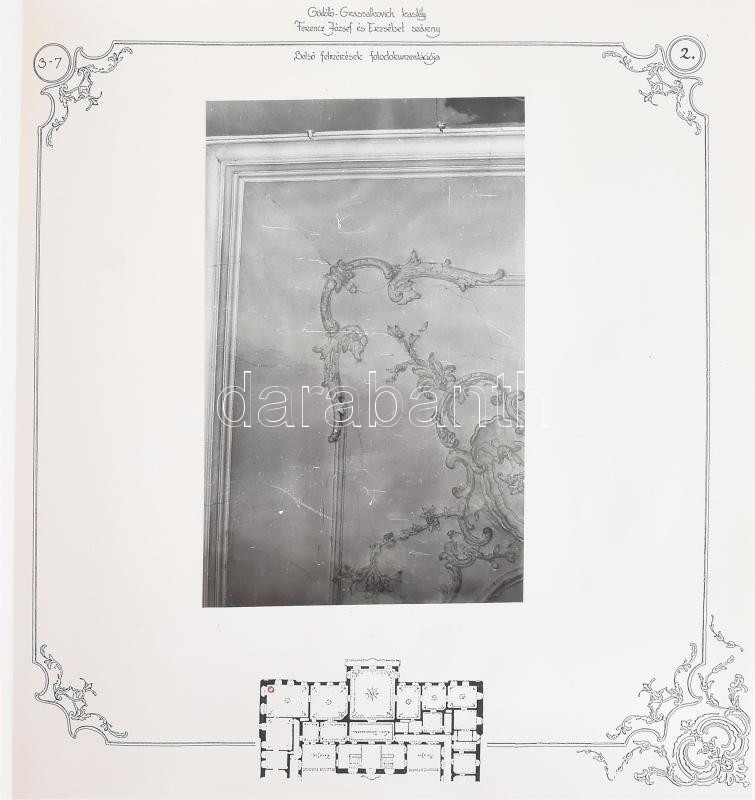 1991 Gödöllői Grassalkovich kastély Állagmegóvási program fotódukomentáció 10. és 11. kötet. A kastély belső terének felújítás előtti állapotáról készült mintegy 150 darab fotó, tervrajzokkal, 2 kötetbe ragasztva.