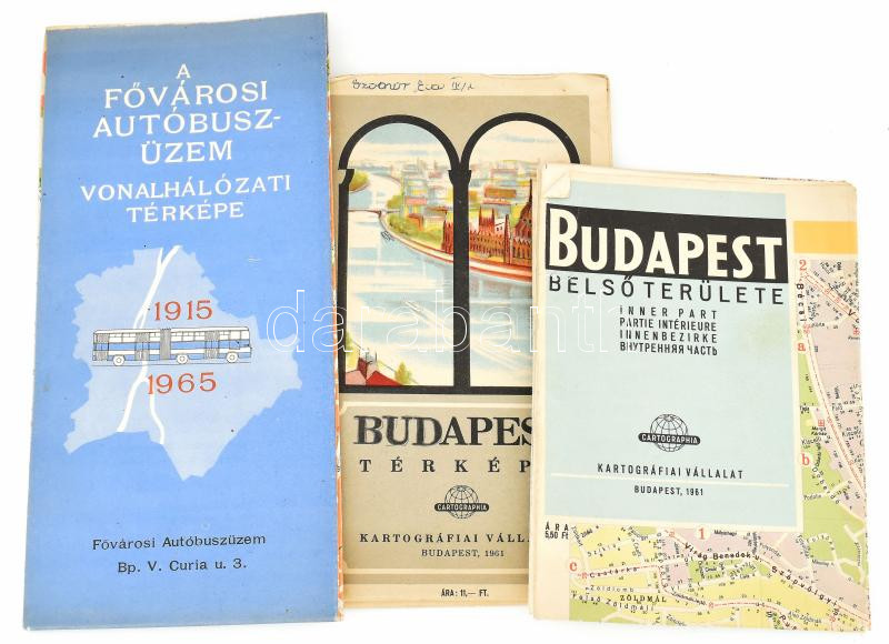 Beschreibung: 1965 A Fővárosi Autóbuszüzem vonalhálózati térképe 1915-1965, 48x68 p. + 1961 Budapest térképe és Budapest belső területe, 80x116 cm és 68x48 cm