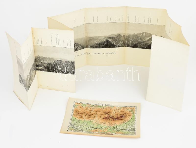 cca 1900 Magas-Tátra térképe, "Pallas Nagy Lexikona", Bp., Posner, 13x19,5 cm + A Magas-Tátra látóképe a Tengerszem csúcsról, Panorámakép a Rysy-ről, nyomtatvány, 24x127 cm/ cca 1900 The map of High Tatra Mountains, In: Pallas Lexicon, Bp., Posner, 13x19,5 cm + Panoramic view picture, print, from the Rysy peak, 24x127 cm