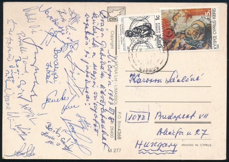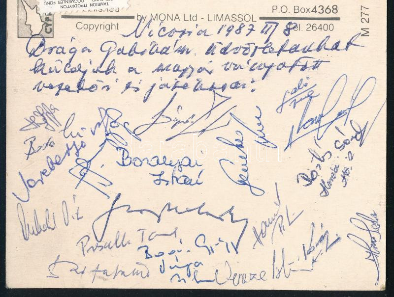 1987 Ciprus-Magyarország labdarúgó válogatott mérkőzésen szerepelt, több játékos, edző és vezető aláírása: Bognár György, Vincze István, Preszeller Tamás, Verebes József, Garab Imre, Boda Imre, Varga István, Herédi Attila stb., Karossa László (1910-1992) fotóriporter, a Magyar Labdarúgó Szövetség első hivatalos fotográfus feleségének küldött képeslapon.