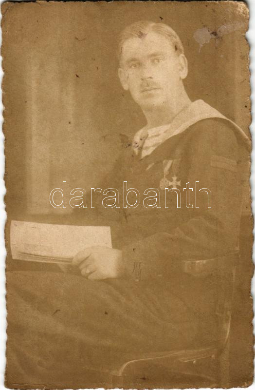 Beschreibung: 1918 Pola, Pula; Polgár János, az SMS Zrínyi Osztrák-Magyar Haditengerészet Radetzky-osztályú pre-dreadnought csatahajó matrózának műtermi portréfotója, hátoldalán kézzel írott verses üzenetével / WWI K.u.k. Kriegsmarine, SMS Zrínyi Austro-Hungarian Navy Radetzky-class pre-dreadnought battleship's mariner. photo (EK)