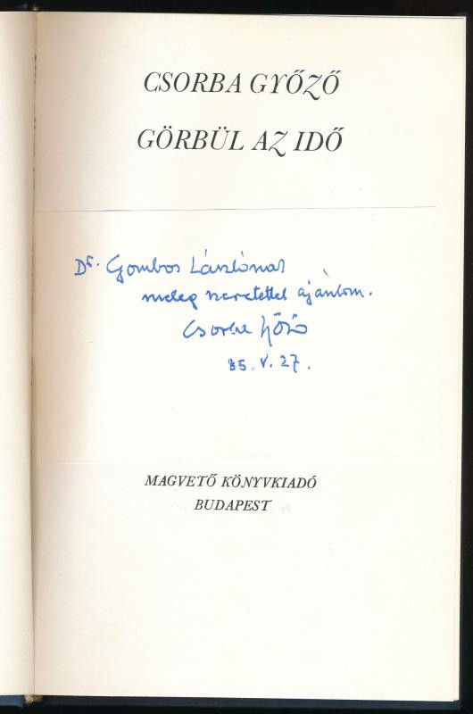 Csorba Győző: Görbül az idő. (Dedikált!) Bp., 1985, Magvető. Első kiadás. Kiadói egészvászon-kötés, ex libris-szel. A szerző, Csorba Győző (1916-1995) Kossuth- és József Attila-díjas költő, műfordító által dedikált példány.