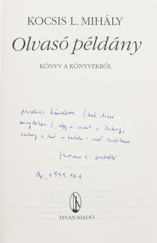 Kocsis L. Mihály: Olvasó példány. Könyv a könyvekről. A szerző, Kocsis L. Mihály (1943 - ) író, újságíró által Mohás Lívia (1928-2024) pszichológus, József Attila-díjas írónak DEDIKÁLT példány. Békéscsaba, 1994, Tevan. Kiadói papírkötés.
