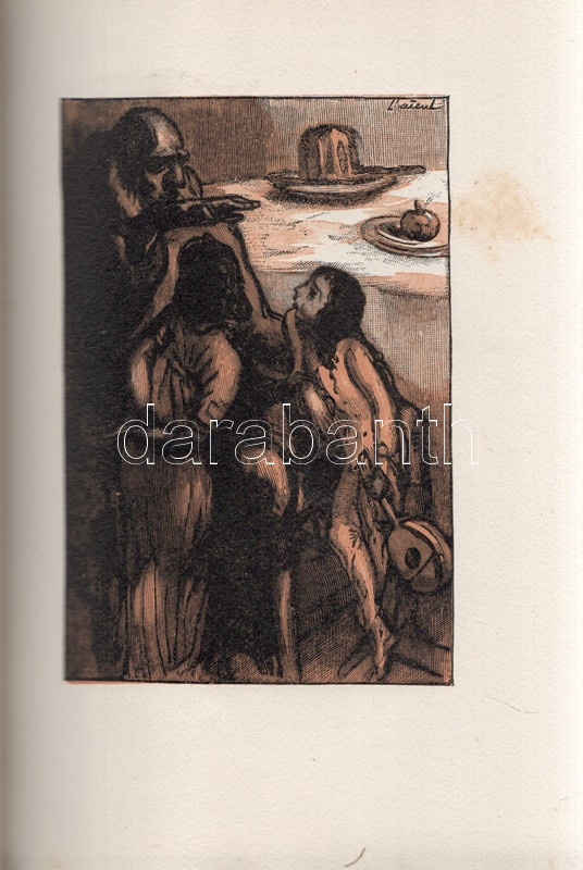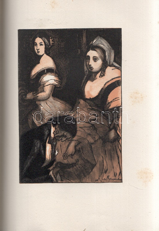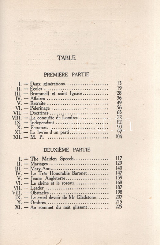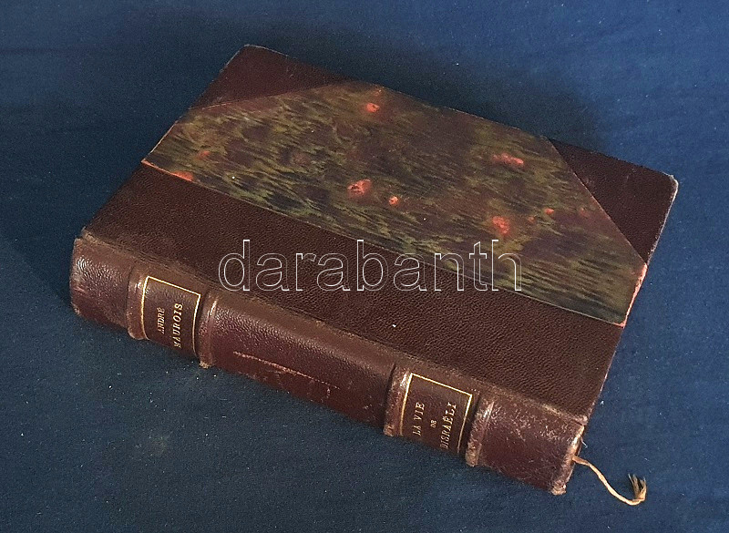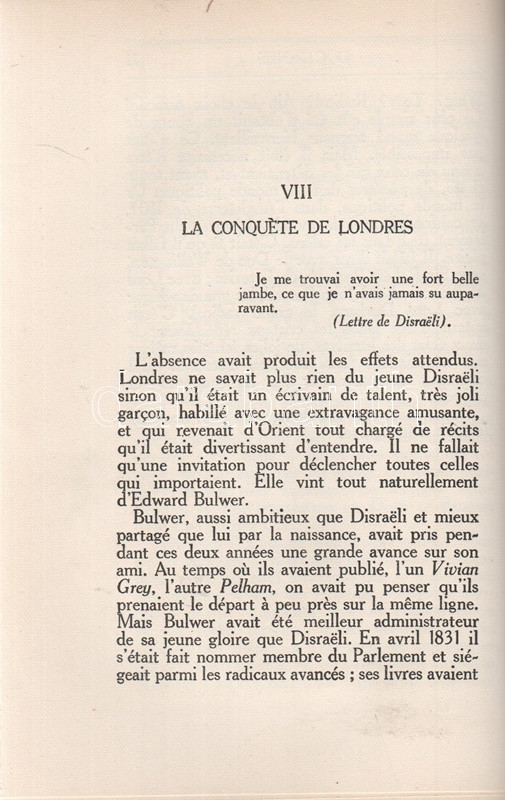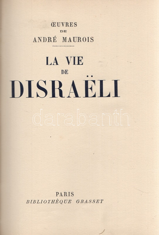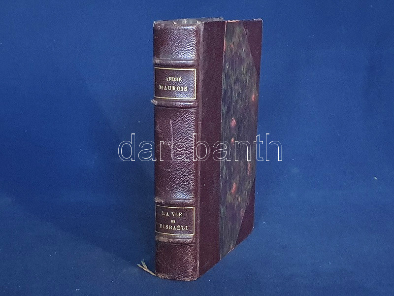 Maurois, André: La vie de Disraeli. Illustrations inédites de Henri Mirande, gravées sur bois en deux coloeurs par André Baudier. (Számozott). Paris, (1929). Bibliothéque Grasset (Imprimerie F. Paillart, Abbeville). 1 t. (hártyapapírral védett színes címkép) + [2] + 344 + [2] p. + 7 t. (hártyapapírral védett színes tábla). Velin papírra készült bibliofil munka számozott példánya, sorszáma: 267. Kolofon: "Avec cette édition il a été tiré quatorze exemplaires sur papier Montval (Canson et Montgolfier) numérotés Montval de A a J et I a IV; et douze exemplaires sur papier Madagascar, numérotés Madagascar I a XII. Exemplaire vélin pur chiffron D 267." André Maurois (1885-1937) francia író korrajzba ágyazott Disraeli-életrajza (politikai életrajza a brit miniszterelnöki székig jutott angol politikusról) először 1927-ben jelent meg. Bibliofil kiadásunkat Henri Mirande (1877-1955) francia grafikusművész hét színes nyomata díszíti. Aranyozott gerincű, álbordázott kiadói félmaroquin kötésben, felül aranyozott lapszélekkel. Körülvágatlan, szép példány.