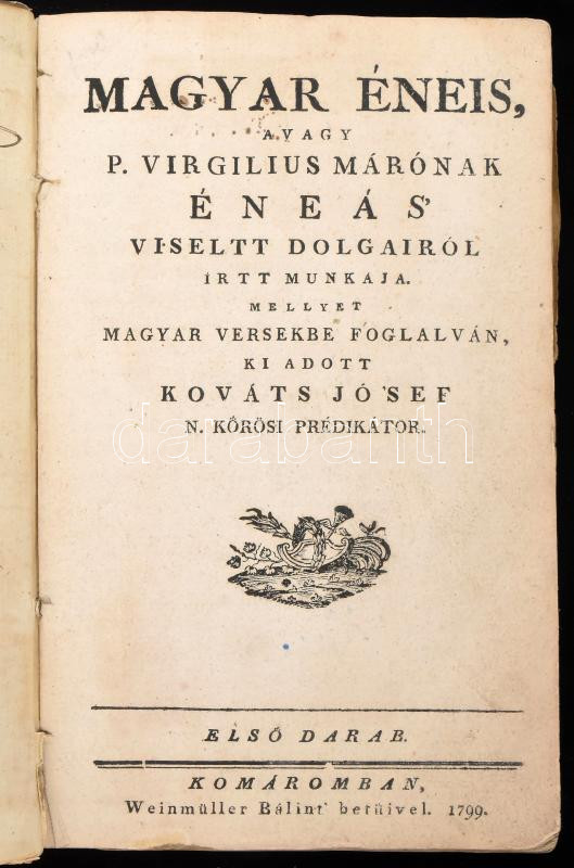[Vergilius, Publius Maro]: Magyar Éneis, avagy P. Virgilius Márónak Éneás' viselt dolgairól írtt munkája. Mellyet magyar versekbe foglalván ki adott Kováts Jó'sef N(agy) Körösi prédikátor. Első darab. Komárom, 1799., Weinmüller Bálint, I-XX,21-234+4 p. Korabeli sérült papírkötésben, possessori bejegyzéssel, valamint "Proprium musei Kossuth Anno 1887" bejegyzéssel.