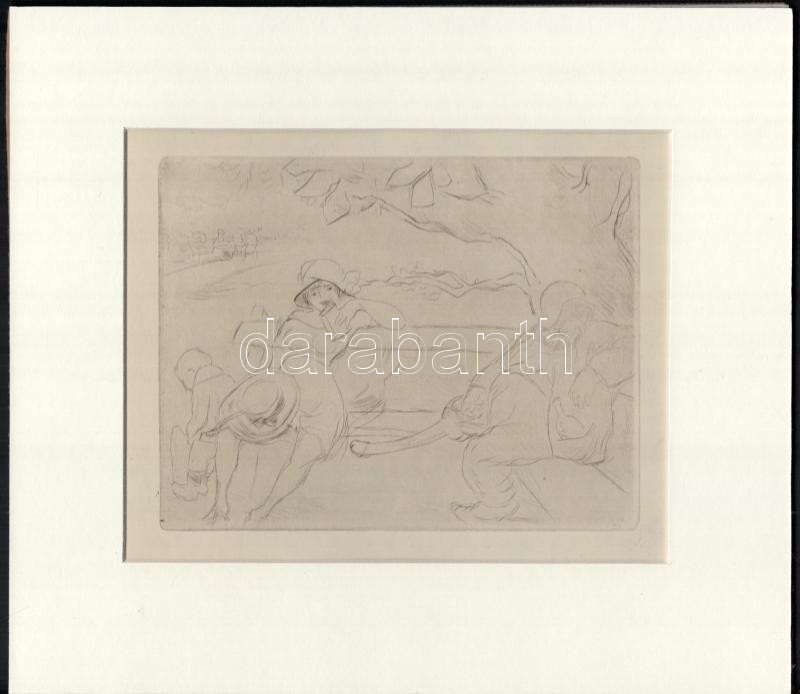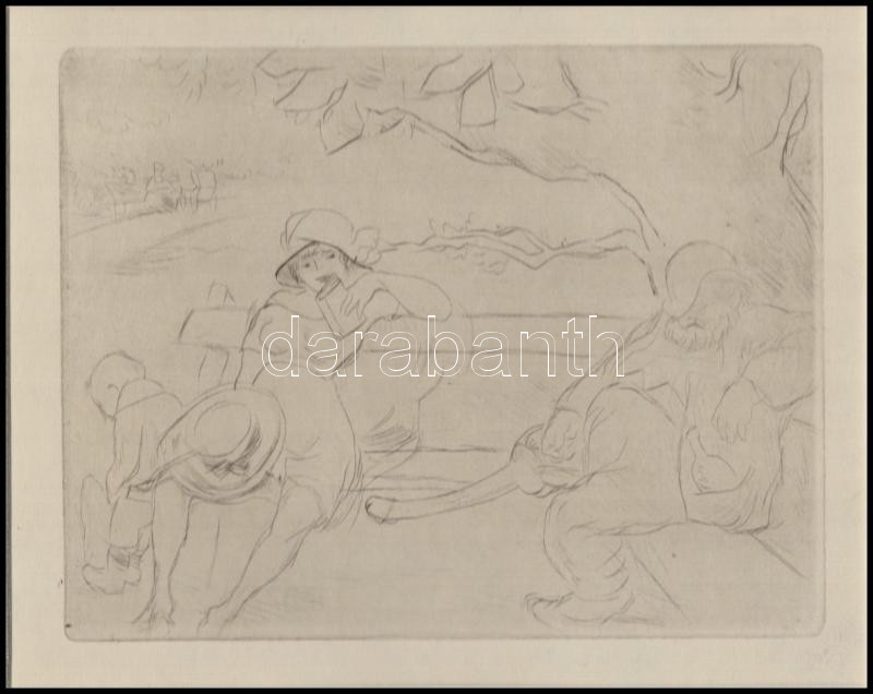 Vértes Marcell (1895-1961): Parkban (erotikus-pornográf grafika). Rézkarc, papír, jelzés nélkül. Az 1921-ben 550 példányban megjelent Le pays a mon gout c. mappából, paszpartuban, 12,5×16,5 cm