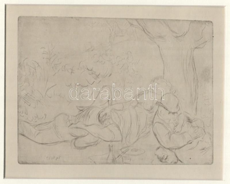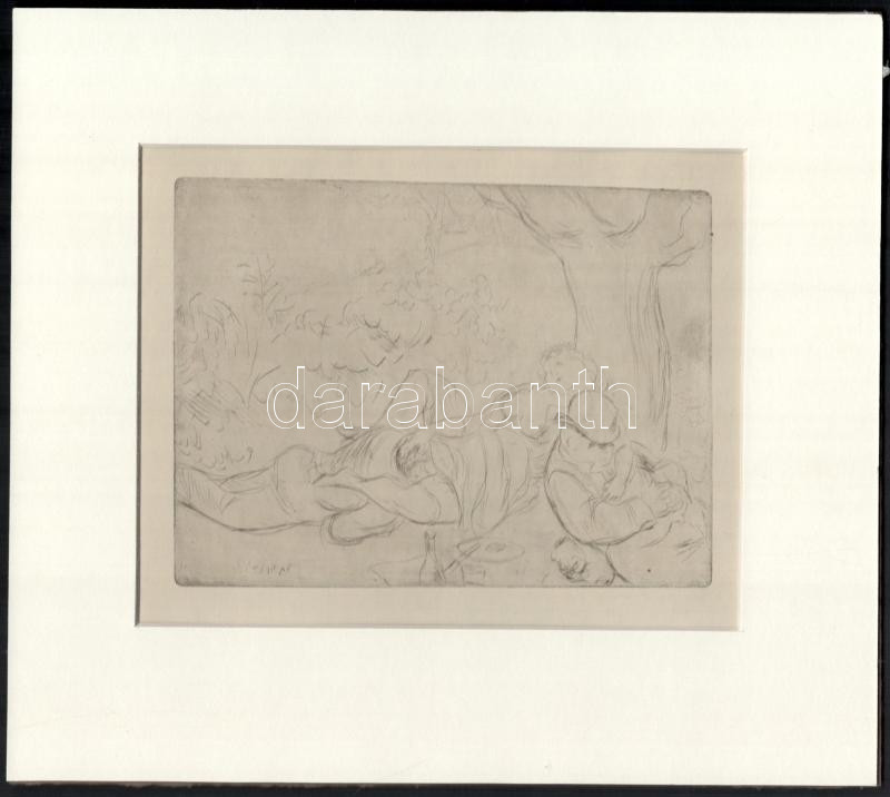 Vértes Marcell (1895-1961): Szerelmi háromszög (erotikus-pornográf grafika). Rézkarc, papír, jelzés nélkül. Az 1921-ben 550 példányban megjelent Le pays a mon gout c. mappából, paszpartuban, 12,5×16,5 cm