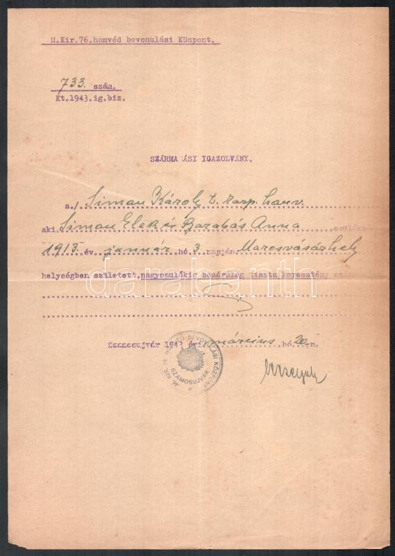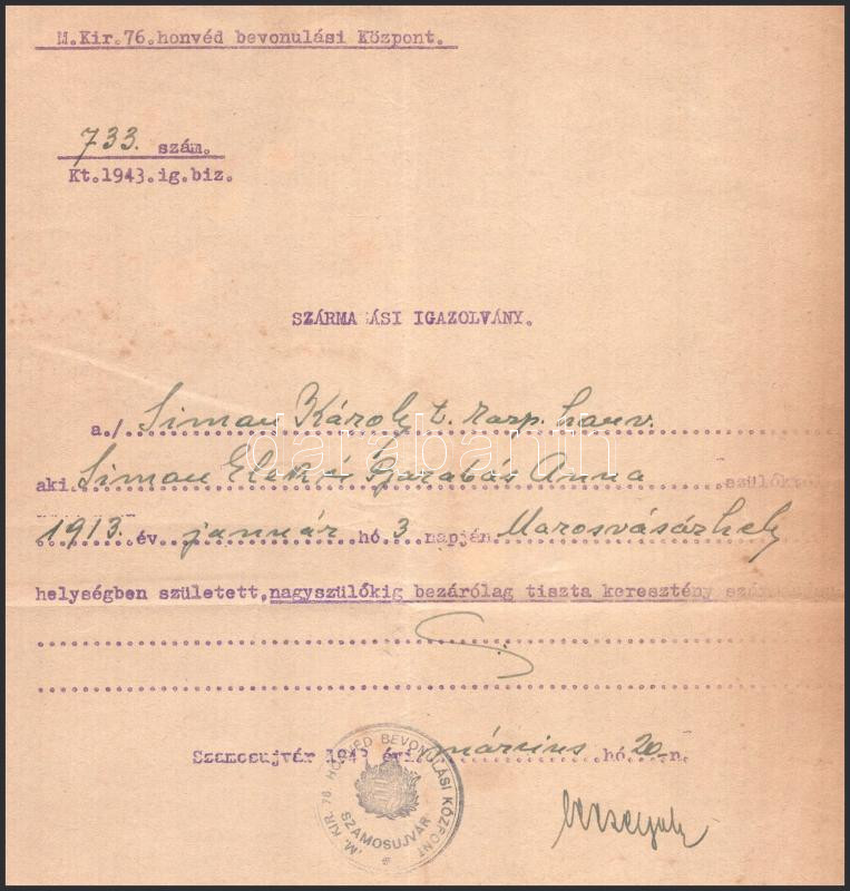 1943 Szamosújvár (Gherla), Erdély, származási igazolvány marosvásárhelyi születésű Simon Károly t. karp. honvéd részére, M. kir. 76. honvéd bevonulási központ bélyegzőjével