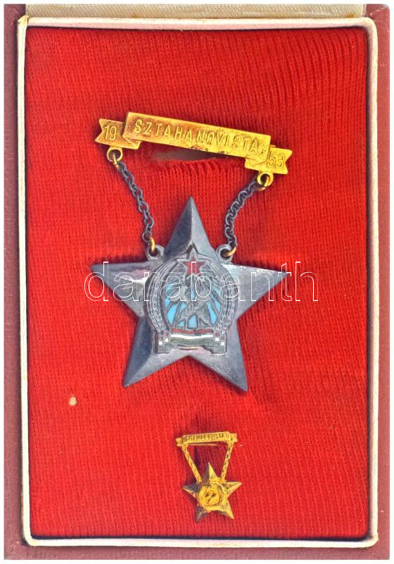 Beschreibung: 1953. "Sztahanovista" zománcozott fém kitüntetés miniatűrrel, eredeti, kissé sérült tokban T:AU,XF