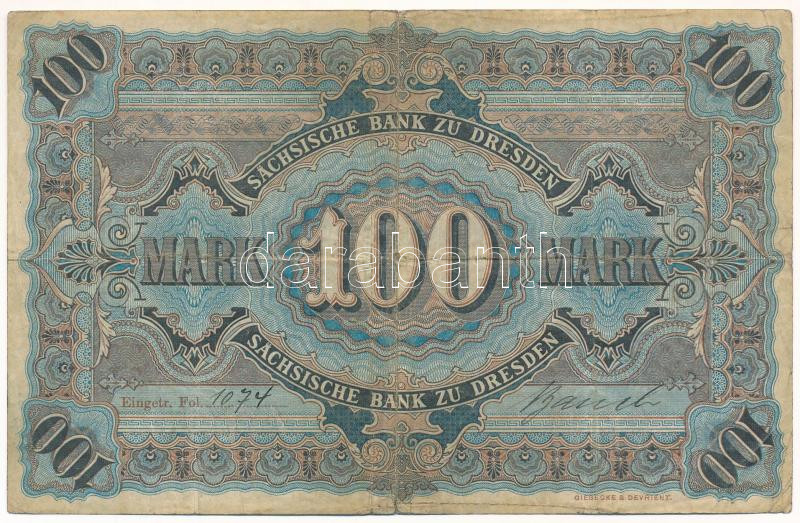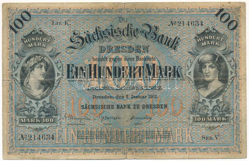 Német Birodalom / Szászország 1911. 100M "hatjegyű sorozatszám" T:F,VG German Empire / Saxony 1911. 100 Mark "six digit serial number" C:F,VG Krause P#S952