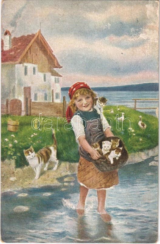 Beschreibung: In treuer Hut / Children art postcard, girl with cats s: R. Hirth du Frenes (Rb)