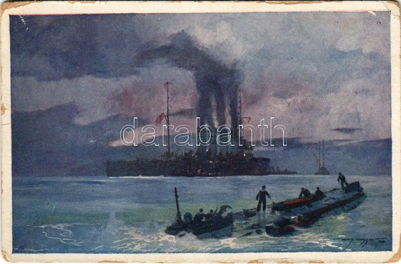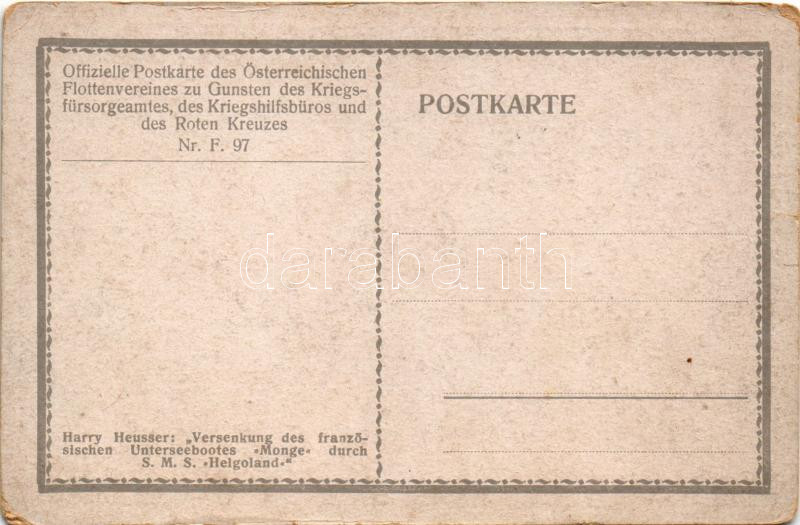 Versenkung des französischen Unterseebootes "Monge" durch SMS Helgoland. K.u.K. Kriegsmarine - Offizielle Postkarte des Österreichischen Flottenvereines zu Gunsten des Kriegsfürsorgeamtes, des Kriegshilfsbüros und des Roten Kreuzes Nr. F. 97. / WWI Austro-Hungarian Navy battle, SMS Helgoland sinking French submarine "Monge". s: Harry Heusser (worn corners)