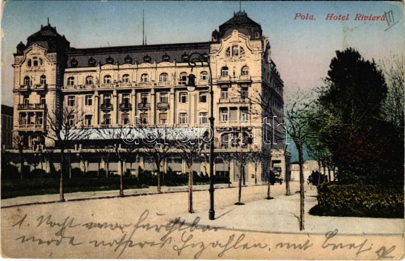 1911 Pola, Pula; Hotel Riviera (kopott sarkak / worn corners) https://www.darabanth.com/de/484-Fernauktion/484.0/Ansichtskarten/Kroatien~2000009/1911-Pola-Pula-Hotel-Riviera-kopott-sarkak-worn-corners~II3140781