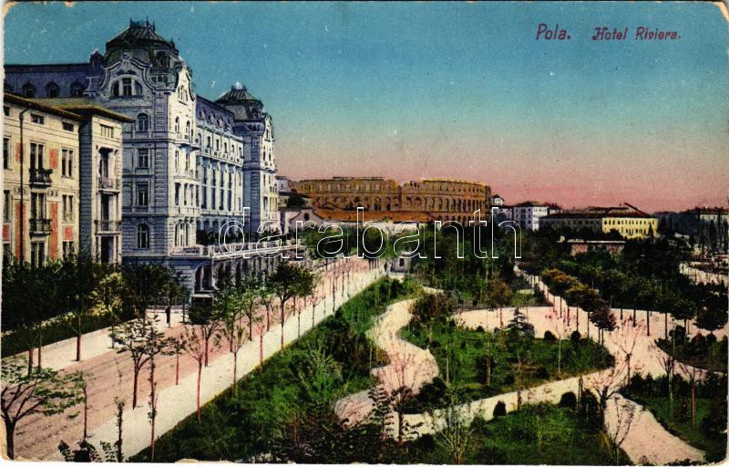 1914 Pola, Pula; Hotel Riviera, tram, park, amphitheatre + "ZENSU... https://www.darabanth.com/de/484-Fernauktion/484.0/Ansichtskarten/Kroatien~2000009/1914-Pola-Pula-Hotel-Riviera-tram-park-amphitheatre-plus-ZENSURIERT-SMS-ADRIA-1XII14-MARINE-~II3140790