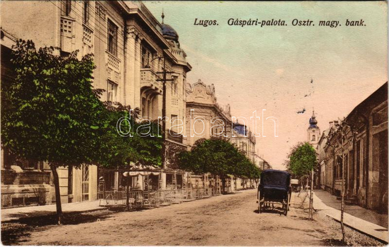 Lugos, Lugoj; Gáspári palota, Osztrák-Magyar Bank, étterem / palace, A... https://www.darabanth.com/de/484-Fernauktion/484.0/Ansichtskarten/Siebenburgen~2000006/Lugos-Lugoj-Gaspari-palota-Osztrak-Magyar-Bank-etterem-palace-Austro-Hungarian-Bank-rest~II3312723