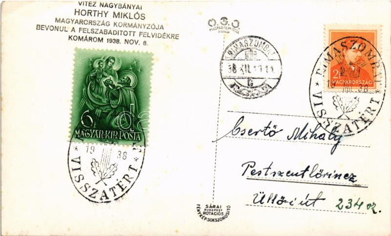 Beschreibung: 1938 Komárom, Komárnó; bevonulás, Horthy Miklós, Purgly Magdolna, Imrédy Béla, Teleki Pál / entry of the Hungarian troops + "1938 Komárom visszatért" So. Stpl. (EK)