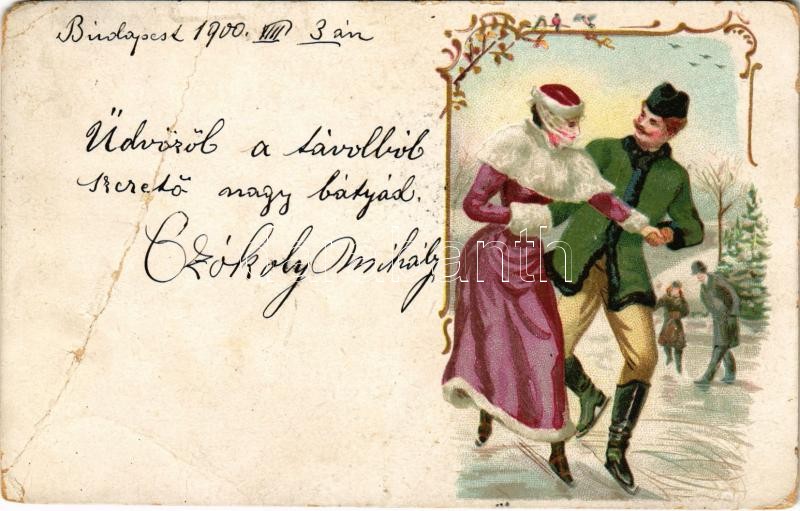 Beschreibung: 1900 Winter sport, ice skating couple. Floral, litho (fa)