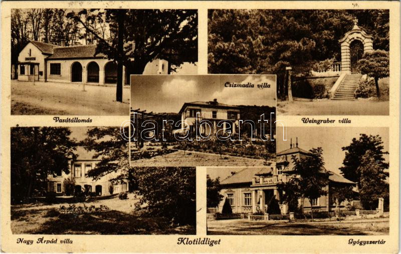 1938 Klotildliget (Piliscsaba), vasútállomás, Weingruber villa, Csizma... https://www.darabanth.com/de/484-Fernauktion/484.0/Ansichtskarten/Ungarn~2000005/1938-Klotildliget-Piliscsaba-vasutallomas-Weingruber-villa-Csizmadia-villa-Nagy-Arpad-vil~II3256597