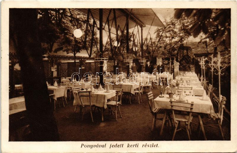 Beschreibung: Budapest I. Tóry György vendéglője "Régi Zöld Hordóhoz", étterem ponyvával fedett kertje. Hattyú utca 14.