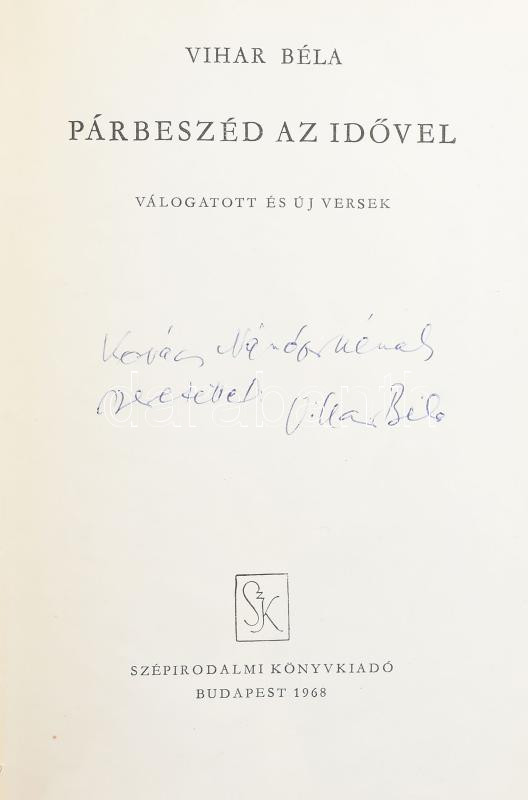 Vihar Béla: Párbeszéd az idővel. Válogatott és új versek. DEDIKÁLT! Bp., 1968., Szépirodalmi. Kiadói egészvászon-kötés, sérült, kissé hiányos kiadói papír védőborítóban.