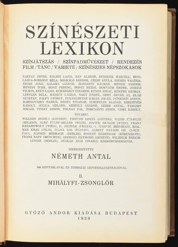 Színészeti Lexikon II. köt. Színjátszás, színpadművészet, rendezés, film, tánc, varieté, színészies népszokások. Szerk.: Németh Antal. Bp., 1930, Győző Andor (Globus-ny.), 545-1099 p.+(3) p.+72 t. Kiadói aranyozott egészvászon-kötés.Jó állapotban