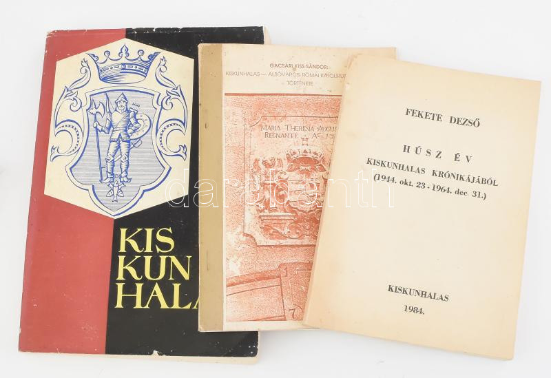 3 db Kiskunhalas helytörténeti könyv: Fekete Dezső: Húsz év Kiskunhalas krónikájából. (1944. okt. 23 - 1964. dec. 31.) Kiskunhalas, 1984, Kiskunhalas Város Tanácsa. Kiadói papírkötés. Megjelent 1000 példányban. + Gacsári Kiss Sándor: Kiskunhalas - Alsóvárosi Római Katolikus Plébánia története. Kiskunhalas, 1991, Római Katolikus Egyházközség. Kiadói tűzött papírkötés, kissé koszos, ázott, foltos borítóval. + Kiskunhalas. Helytörténeti monográfia I. Szerk.: Janó Ákos. Kiskunhalas, 1965, Városi Tanács Végrehajtó Bizottsága. Fekete-fehér képekkel illusztrálva. Kiadói papírkötés, kissé foltos borítóval, kissé sérült, foltos kiadói papír védőborítóban.