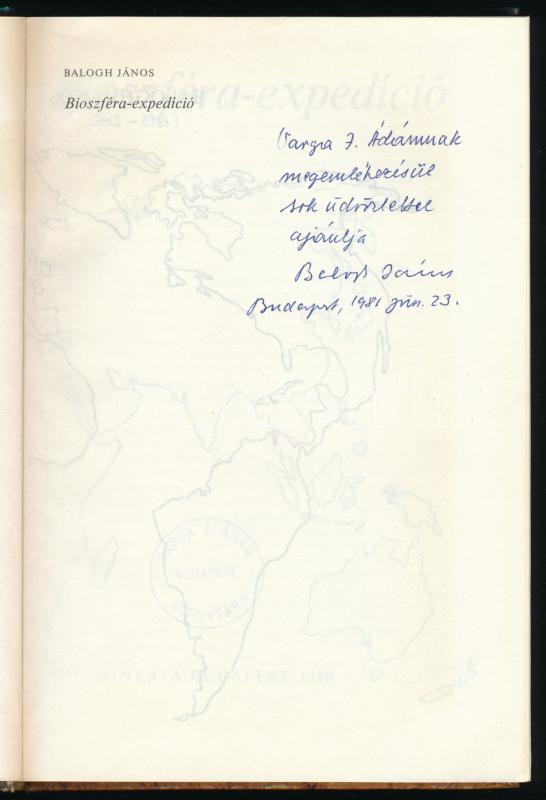 Balogh János: Bioszféra-expedíció. (Dedikált!) Bp., 1980, RTV-Minerva. Kiadói kartonált papírkötés, a gerincen kis sérüléssel, tulajdonosi bélyegzővel. A szerző, Balogh János (1913-2002) Kossuth- és Széchenyi-díjas zoológus, ökológus, egyetemi tanár, az MTA tagja által dedikált példány.