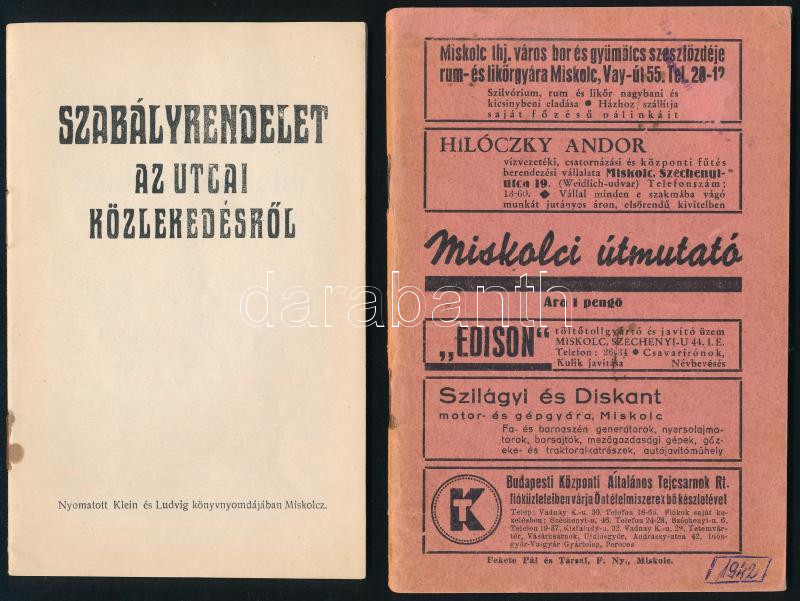 2 db Miskolc várossal kapcsolatos kiadvány: Miskolci útmutató. Szerk. és kiadja: Földes Lajos. Miskolc, (1942), Fekete Pál és Társai-ny., 4 sztl. lev.+ 40 p.+ 4 sztl. lev. Hirdetésekkel. Kiadói tűzött papírkötés, kissé viseltes borítóval, az első lap tetején hiánnyal. + Szabályrendelet az utcai közlekedésről. Miskolc, (1914), Klein és Ludvig-ny., 20 p. Kiadói tűzött papírkötés, kis foltokkal.