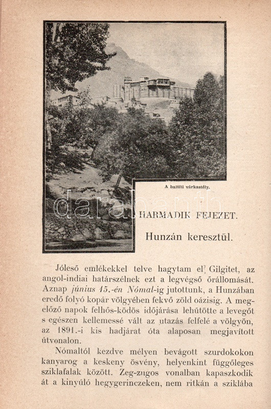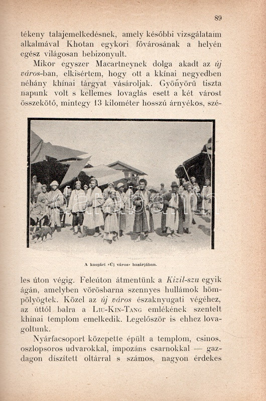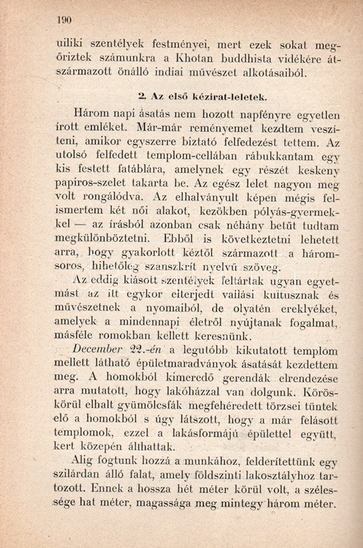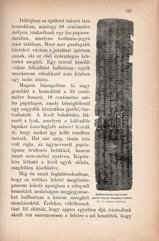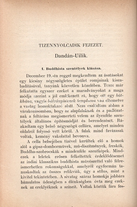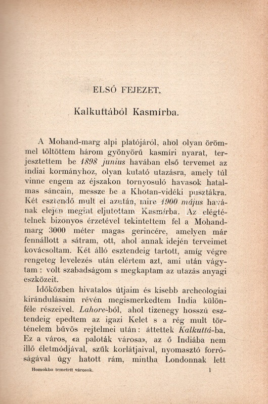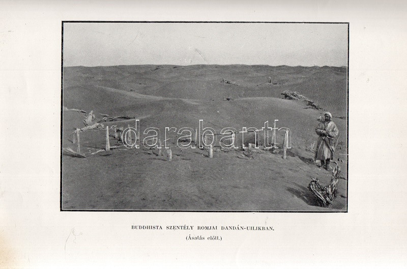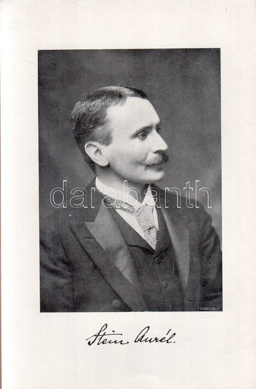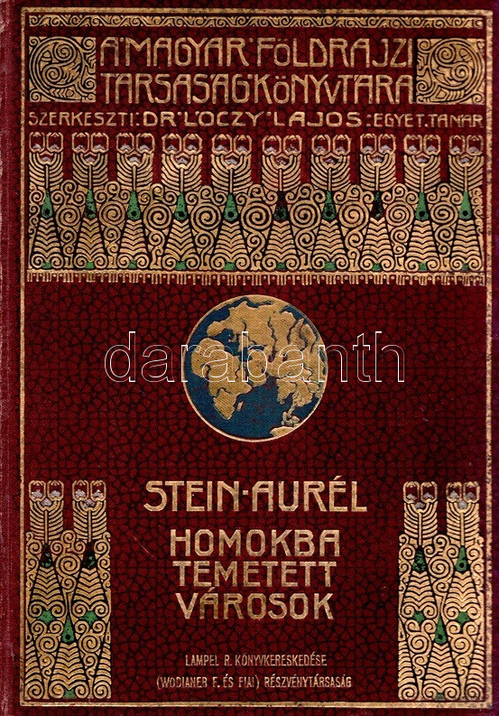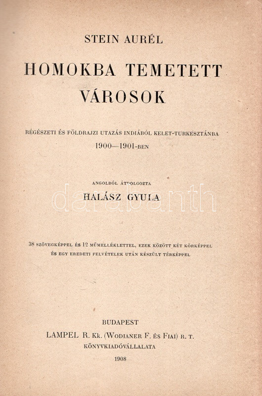 Stein Aurél: Homokba temetett városok. Régészeti és földrajzi utazás Indiából Kelet-Turkesztánba 1900-1901-ben. Angolból átdolgozta Halász Gyula. Budapest, 1908. Lampel Róbert - Wodianer F. és Fiai Rt. (Franklin-Társulat ny.) 1 t. (címkép) + XXIV + 326 p. + 10 t. (2 kihajtható). Első magyar kiadás. Stein Aurél (1862-1943) Közép-Ázsia-kutató kisebb megszakításokkal 1886-tól dolgozott az indiai brit adminisztrációnak, több helyi egyetemen is oktatott, 1900-1931 között négy nagy hatású expedícióban térképezte fel Belső-Ázsia fehér foltjait. E műve első, 1900-1901-es belső-ázsiai kutatóútjának beszámolója. A néprajzi és régészeti részletekben gazdag, kalandos beszámoló szövegét oldalszámozáson belül számos szövegközti felvétel kíséri. A munka első kiadása 1904-ben jelent meg, "Sand-Buried Ruins of Khotan" címmel. Példányunkból a kötet végi térkép hiányzik, a könyvtest a második kiadás - gerincén kötetsorszámozást nélkülöző - kötéstáblájába kötve. (A Magyar Földrajzi Társaság könyvtára.) Díszesen, dúsan aranyozott, festett, vaknyomásos kiadói egészvászon kötésben, márványmintás festésű lapszélekkel. Szép példány.