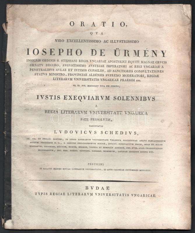 Schedius Lajos: Oratio qua? Josepho de Ürmény? Buda, Typ. Univ., 1825.... https://www.darabanth.com/de/484-Fernauktion/484.0/Bucher/Bucher-Religion~1000040/Schedius-Lajos-Oratio-qua-Josepho-de-Urmeny-Buda-Typ-Univ-1825-41p~II3291982