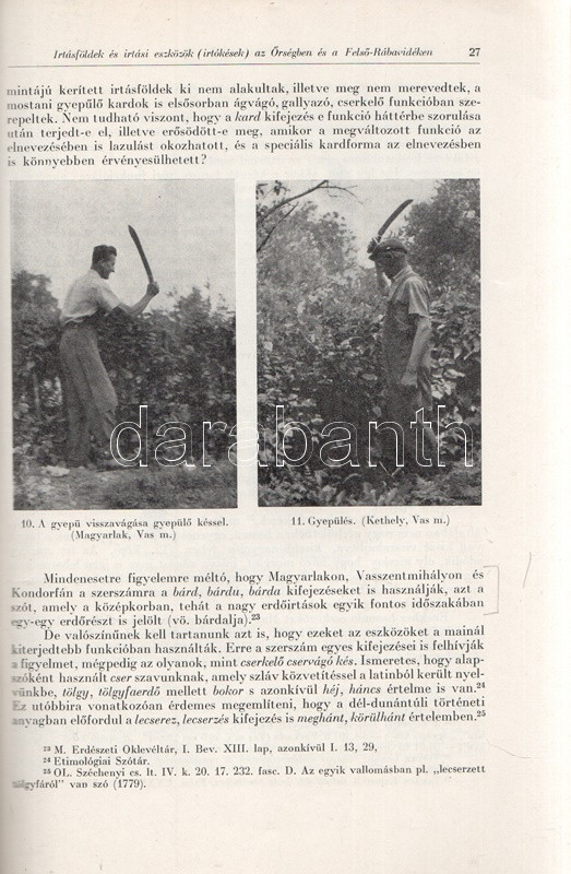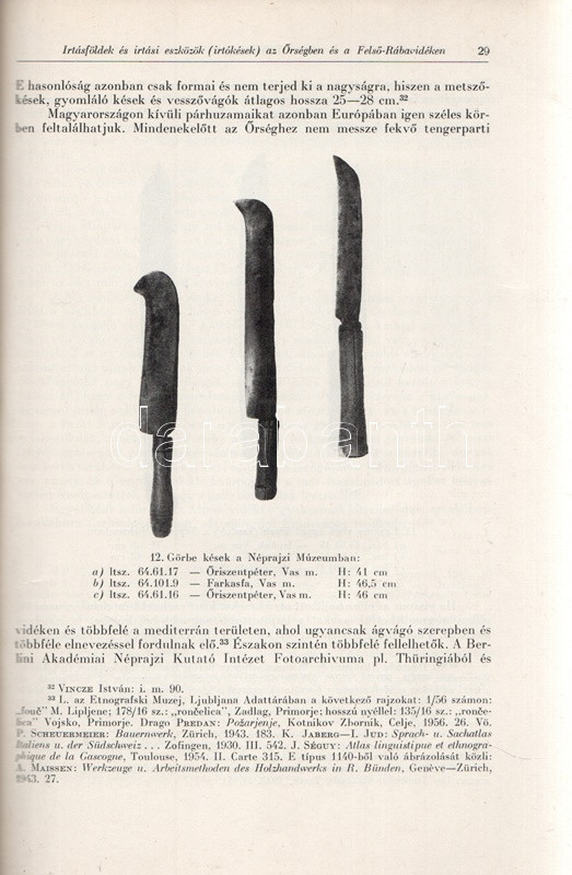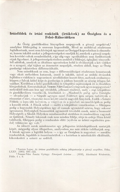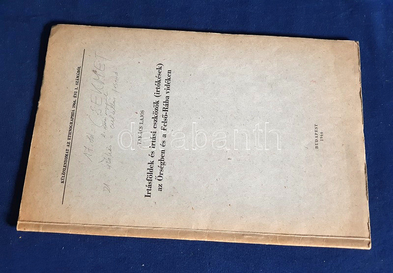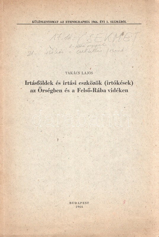 Takács Lajos: Irtásföldek és irtási eszközök (irtókések) az Őrségben és a Felső-Rába vidékén. Budapest, 1966. (Akadémiai Nyomda). [11]-48 p. Egyetlen kötetkiadás. Dedikált: "Major Jenőnek baráti szeretettel: Takács Lajos": Takács Lajos (1921-1985) néprajztudós munkája a sajátosan nedves klímájú, kötött, agyagos, küzdelmesen művelhető talajú Őrség mezőgazdaságának kulcsfontosságú irtási feladatának néprajzi összetevőit vizsgálja, oldalszámozáson belül gazdag illusztrációs anyaggal. Az első borítón kézírásos jegyzet. (Különlenyomat az Ethnographia 1966. évi 1. számából.) Prov.: Major Jenő (1922-1988) településtörténész, földrajztudós, urbanisztikai szakíró. Fűzve, kiadói borítóban. Jó példány.
