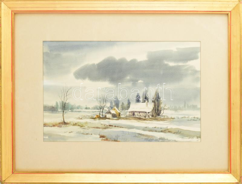 Beschreibung: Reinhardt István (1936-): Szolnoki határban. Akvarell, papír, jelzett, hátoldalán Képcsarnok Vállalat címkéjével. Dekoratív, üvegezett fakeretben, 27,5x42,5 cm