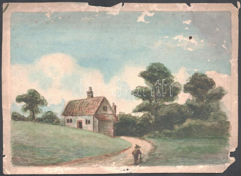 Jelzés nélkül, feltehetően XIX. sz. alkotó, 3 db mű: Tájak emberekkel, szélmalommal. Akvarell, papír, kissé sérült. 14x19 és 16x23,5 cm közötti méretekben.