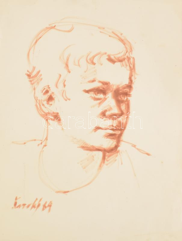 Beschreibung: Olvashatatlan (Karakó?) jelzéssel: Arckép, 1960-as évek. Tus, papír. Apró lapszéli szakadásokkal. 42x29,5 cm
