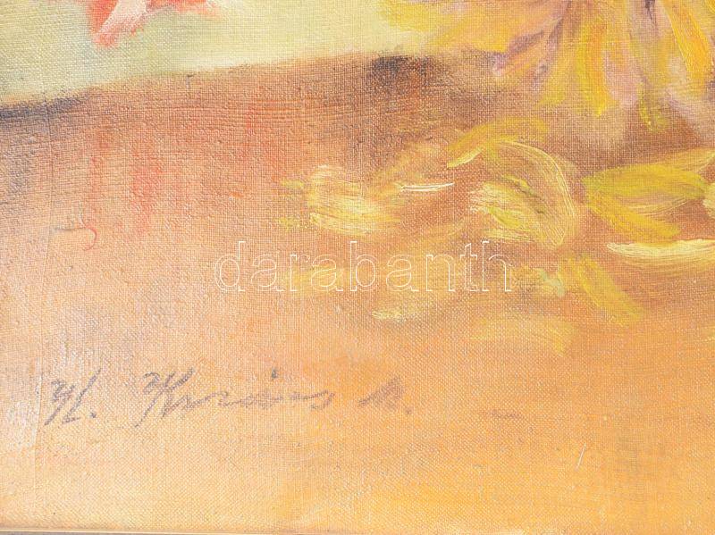 Beschreibung: Olvashatatlan jelzéssel: Virágcsendélet. Olaj, vászon, jelzett, fa keretben 66x70 cm