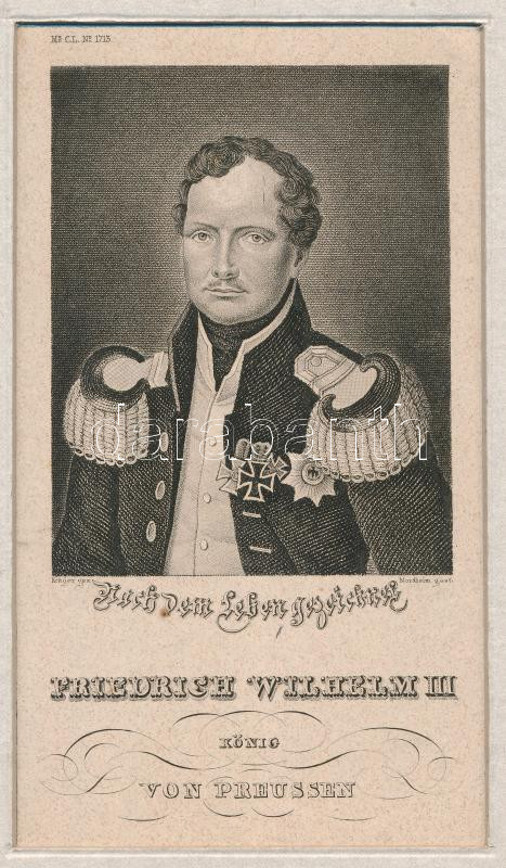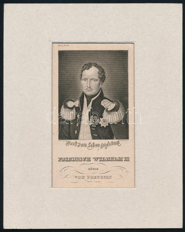 III. Frigyes Vilmos porosz király portréja. Acélmetszet, papír, jelzet... https://www.darabanth.com/de/484-Fernauktion/484.0/Gemalde-und-Grafiken/Stich~1500004/III-Frigyes-Vilmos-porosz-kiraly-portreja-Acelmetszet-papir-jelzett-a-metszeten-paszpartuba~II3257415