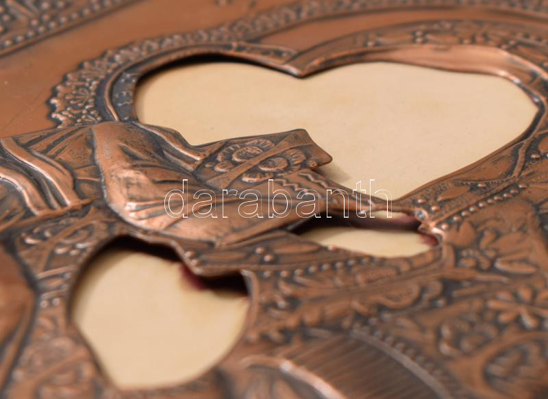 Beschreibung: Mária a kis Jézussal ikon réz okládja, fa lapra erősítve, 23x18 cm