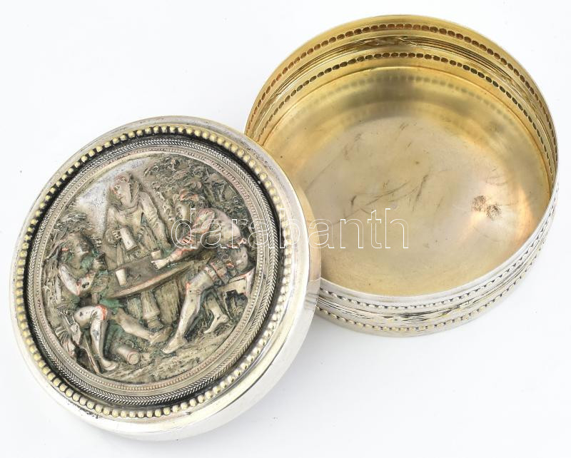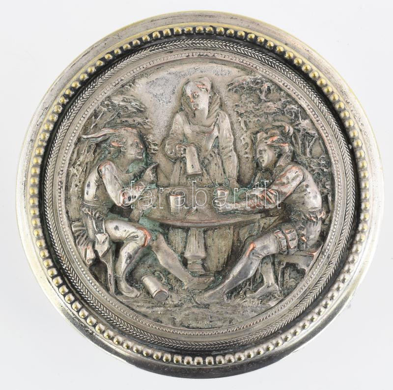 Beschreibung: Historizáló jelenetes ezüstözött cukordoboz, jelzett, kopott, d: 10,5 cm