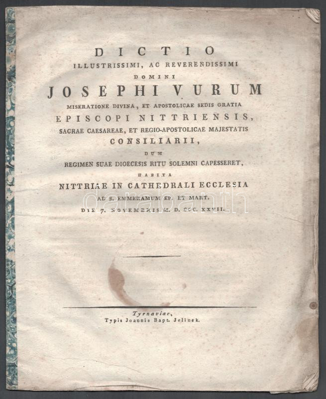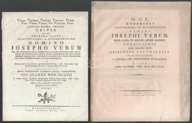 cca 1810-1850 5 db főpapokat dícsőítő beszéd lenyomata Vurum József székesfehérvári, váradi, majd nyitrai püspök, Klobusiczky Péter szatmári püspök, kalocsai érsek, Alagovich Sándor zágrábi püspök, Verhovácz Miksa zágrábi püspök