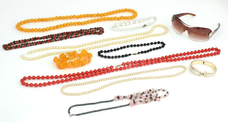 Beschreibung: Egy doboznyi bizsu tétel: dekoratív nagy szemű nyakláncok, karkötők, egy retro design napszemüveg
