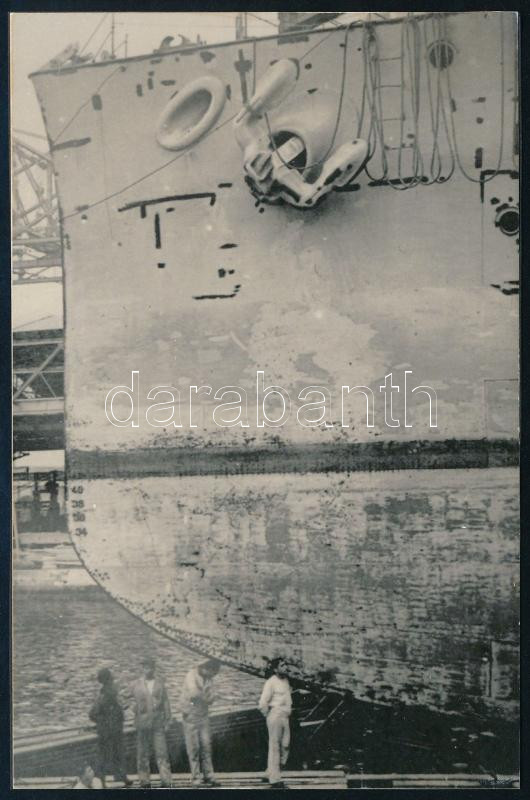 1914 Az S.M.S. Helgoland, az osztrák-magyar haditengerészet hajójának tatja a francia Monge tengeralattjáróval való csatája után. 10x14 cm / dry dock in Pola, shows the keel of S.M.S. Helgoland after the Austrian cruiser rammed the French submarine Monge.