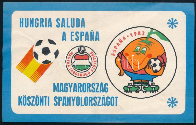 1982 Magyarország köszönti Spanyolországot, Hungria saluda a Espana, az 1982-es labdarúgó világbajnokság alkalmából kiadott illusztrált, egyoldalas reklámlap, hajtásnyommal, apró gyűrődéssel9,5x15 cm