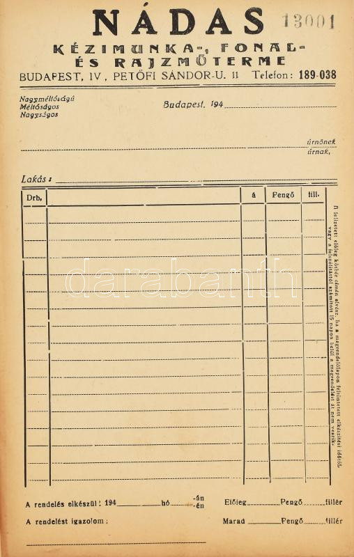 cc 1940 Nádas kézimunka- fonal és rajzműterme számla füzet 130 sorszám... https://www.darabanth.com/de/484-Fernauktion/484.0/Kunst-Dokumente-andere-Sammelgebiete/Werbungen~1000002/cc-1940-Nadas-kezimunka-fonal-es-rajzmuterme-szamla-fuzet-130-sorszamozott-lappal-Kitoltetl~II3188408